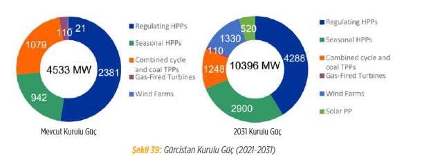 Gürcistan İletim Sistemi İşleticisi tarafından hazırlanan 2021-2031 dönemini kapsayan 10-Yıllık Sistem Gelişim Planına göre; ülke kurulu gücünün 4533 MW’dan 10396 MW’a yükseltilmesi hedeflenmiştir.