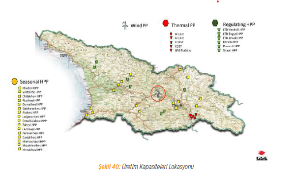 2021 yıl sonu itibarı ile Gürcistan’ın toplam kurulu gücü 4533 MW, üretim kapasitesi ise yılda 12.6 GWh’dir. Ülke kurulu gücünün %73’ü hidrolik (3324 MW) %26’sı gaz santrallarından (1189 MW) oluşmakta olup 21 MW gücünde bir adet rüzgar santralı bulunmaktadır. Ülkede yenilenebilir enerji kaynağı olarak 2381 MW baraj tipi HES ve 942 MW kanal tipi HES, 21 MW gücünde 1 adet rüzgâr santralı ve toplamda yaklaşık 4 MW gücünde çatı tipi güneş santralı bulunmaktadır.