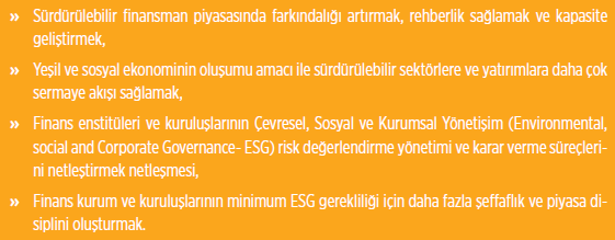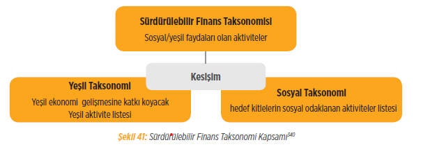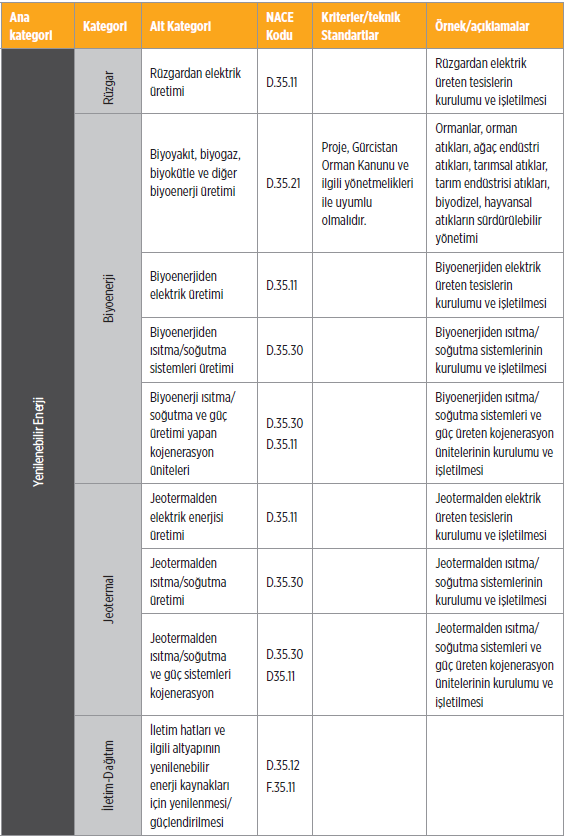 » Yeşil Taksonomi: Yeşil ekonominin gelişimine katkı sağlayacak çevresel etkenleri kapsayan aktiviteler; yenilenebilir enerji kaynakları, enerji verimliliği, atık yönetimi, sürdürülebilir su kaynakları, yeşil ulaşım, sürdürülebilir tarım – çiftçilik, sürdürülebilir üretim ve ticaret, yeşil hizmetler bu kategoride değerlendirilmiştir.