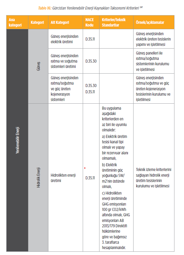 Gürcistan taksonomisi oluşturulurken yeşil ve sosyal taksonomi kapsamında yer alan alt başlıkların hazırlanmasında değişik kuruluş ve ülkelerin taksonomi uygulamaları dikkate alınmıştır.