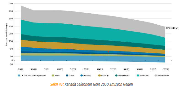 Kanada, Paris Anlaşması uyarınca 2030 yılına kadar sera gazı emisyonlarını 2005 seviyelerinin %30 altına düşürmeyi taahhüt etmişti. Ancak Temmuz 2021’de bu hedefi genişleterek 2030 yılına kadar emisyonları 2005 seviyelerinin %40 altına düşüreceğini taahhüt etti. Bu kapsamda karbon fiyatlandırması, emisyon ticareti gibi çeşitli iklim değişikliği azaltma politikaları uygulamaya devam etmektedir. Bu bağlamda belirlenen birçok politika Avrupa Birliği Yeşil Mutabakatı kapsamında belirlenen birçok politika ile örtüşmektedir.