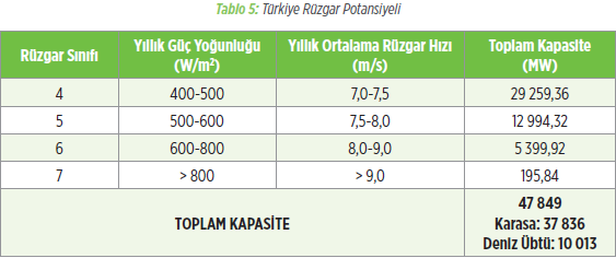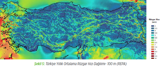 Türkiye rüzgar enerjisi potansiyeli açısından oldukça şanslı bir ülkedir. 2006 yılında hazırlanan Türkiye Rüzgar Enerjisi Potansiyeli Atlası (REPA-V1) verilerine göre, yer seviyesinden 50 metre yükseklikte ve 7,5 m/s üzeri yıllık ortalama rüzgar hızlarına sahip kullanılabilir alanlarda kilometrekare başına 5 MW gücünde rüzgar santralı kurulabileceği kabul edilmiş ve Türkiye’de kurulabilecek rüzgar elektrik santrallarının toplam kapasitesinin 47.849,44 MW olduğu belirlenmiştir. Sonuçlar aşağıdaki tabloda detaylı bir şekilde verilmektedir (Türkiye Rüzgar Enerjisi Potansiyeli Atlası, 2006).