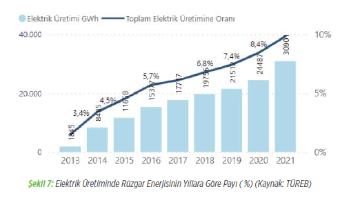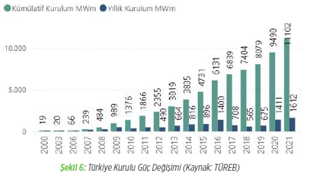 2022 Eylül sonu itibariyle rüzgar enerjisine dayalı elektrik kurulu gücümüz 11.199 MW, toplam elektrik üretimi içerisindeki payı yaklaşık %946 olup yıllara göre kurulu güç değişimi ve toplam elektrik üretimi içerisindeki payı aşağıdaki grafiklerde yer almaktadır.