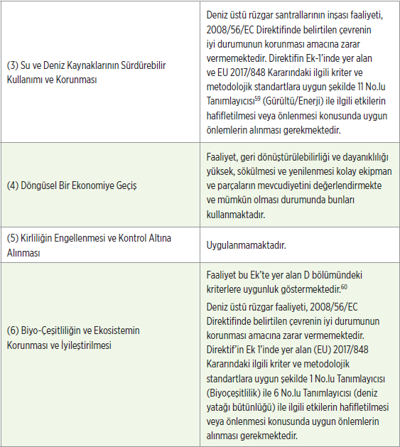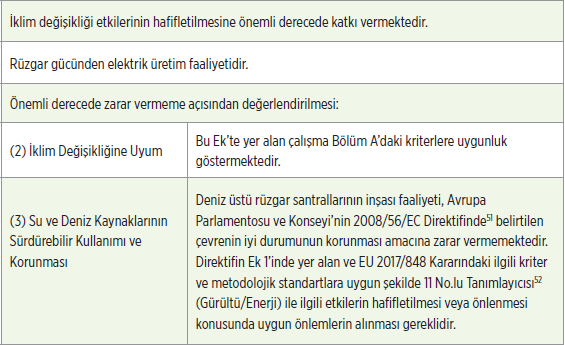 2020/852 sayılı Taksonomi Tüzüğü, özel olarak rüzgar enerjisine yer vermemiştir. Ama rüzgar enerjisinin, yenilenebilir enerji olduğundan hareketle, yenilenebilir enerjiye ait maddeler rüzgar içinde geçerli olacaktır.
