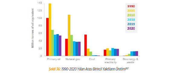 Birincil yakıtlar kapsamında, birincil petrol (ham petrol ve doğal gaz sıvıları) toplam üretimin %43, doğal gaz %30, birincil elektrik (nükleer, rüzgar, güneş ve hidrolik) %15, biyoenerji ve atık %10 kömür ise kalan %1’i oluşturmaktadır.