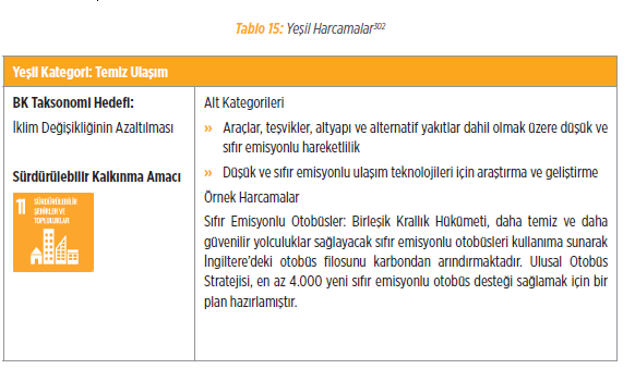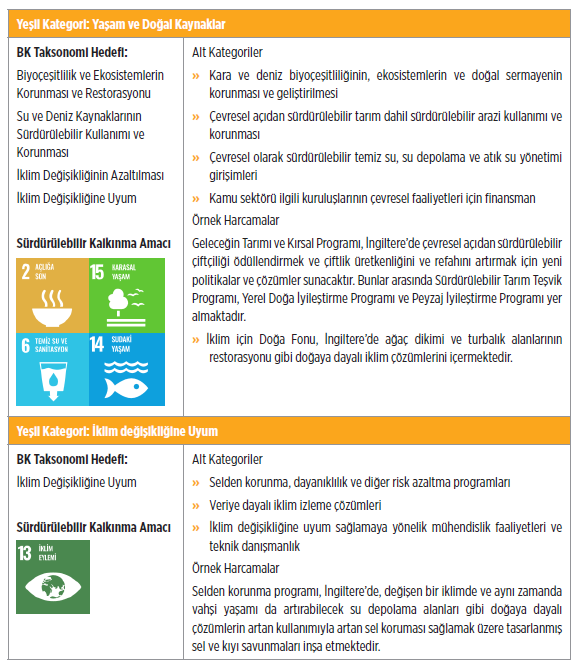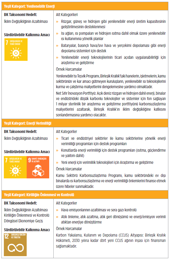 Birleşik Krallık Hazinesi, yeşil finans araçlarından elde edilen gelirler vasıtasıyla Yeşil Finansman Çerçevesinde belirlenen çevresel uygunluk kriterlerini karşılayan harcamaları (Eligible Green Expenditures-Yeşil Harcamalar) finanse etmeyi amaçlamakta olup net gelirlerin en az %50’sini cari ve gelecekteki harcamalara tahsis edecektir. Aşağıdaki tabloda, Yeşil Harcamalar ICMA Yeşil Tahvil İlkeleri hedefleri, BM Sürdürülebilir Kalkınma Amaçları301 ve BK Taksonomi hedefleri ile birlikte sunulmaktadır: